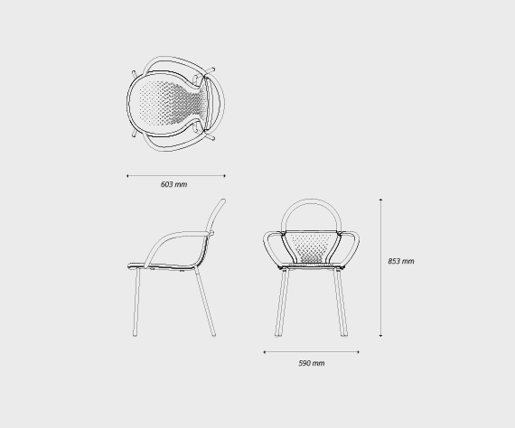 Selon Karim Rashid:"KOSE est un fauteuil café empilable qui répond aux besoins de l'intérieur comme de l'extérieur, le fauteuil KOSE est léger, confortable et résistant aux intempéries. Il se distingue par ses perforations uniques en forme de blob dans sa forme en aluminium revêtue de poudre, permettant à l'eau de s'écouler à travers la chaise plutôt que de s'accumuler."